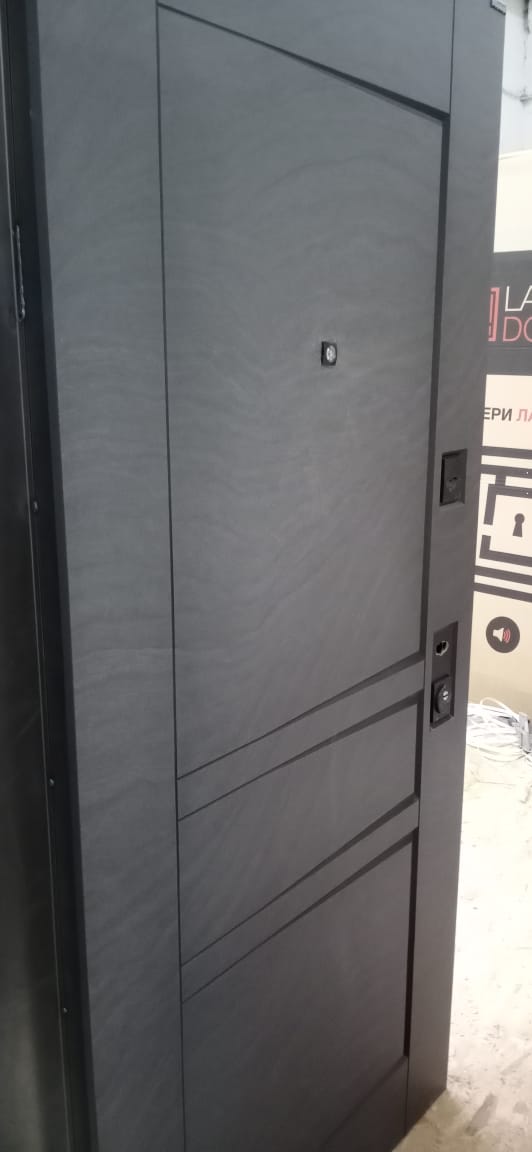 Черная матовая: Броненакладкая, сувальдные накладки со шторкой, ручка, ночник, цилиндр ключ-вертушка, глазок врезан в центре, или сбоку