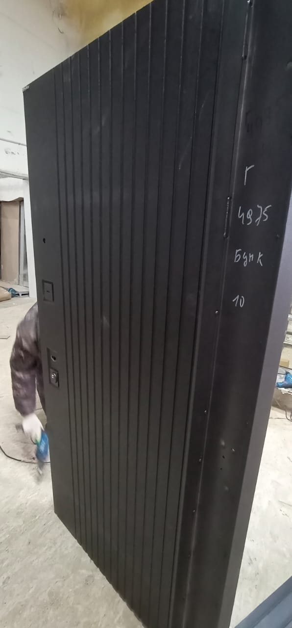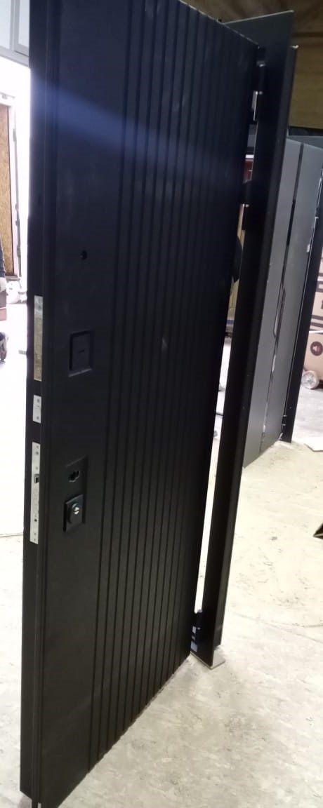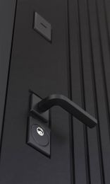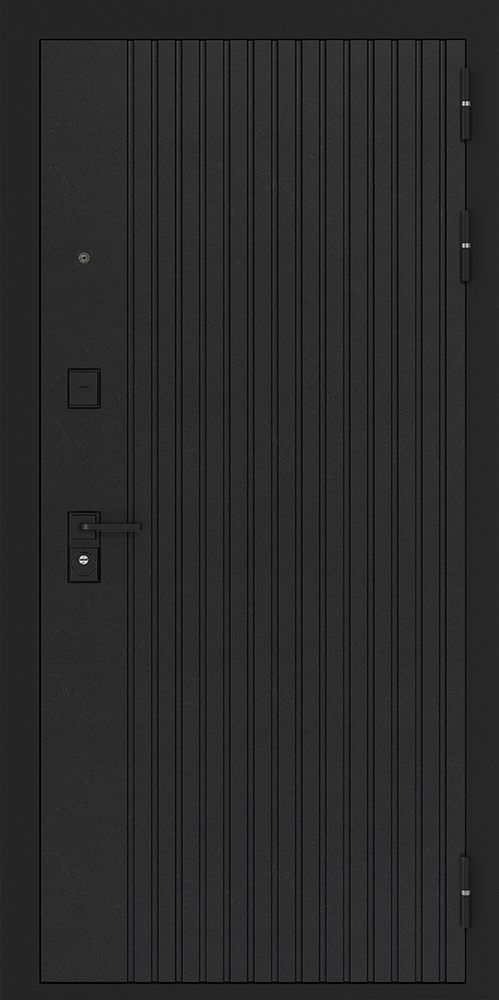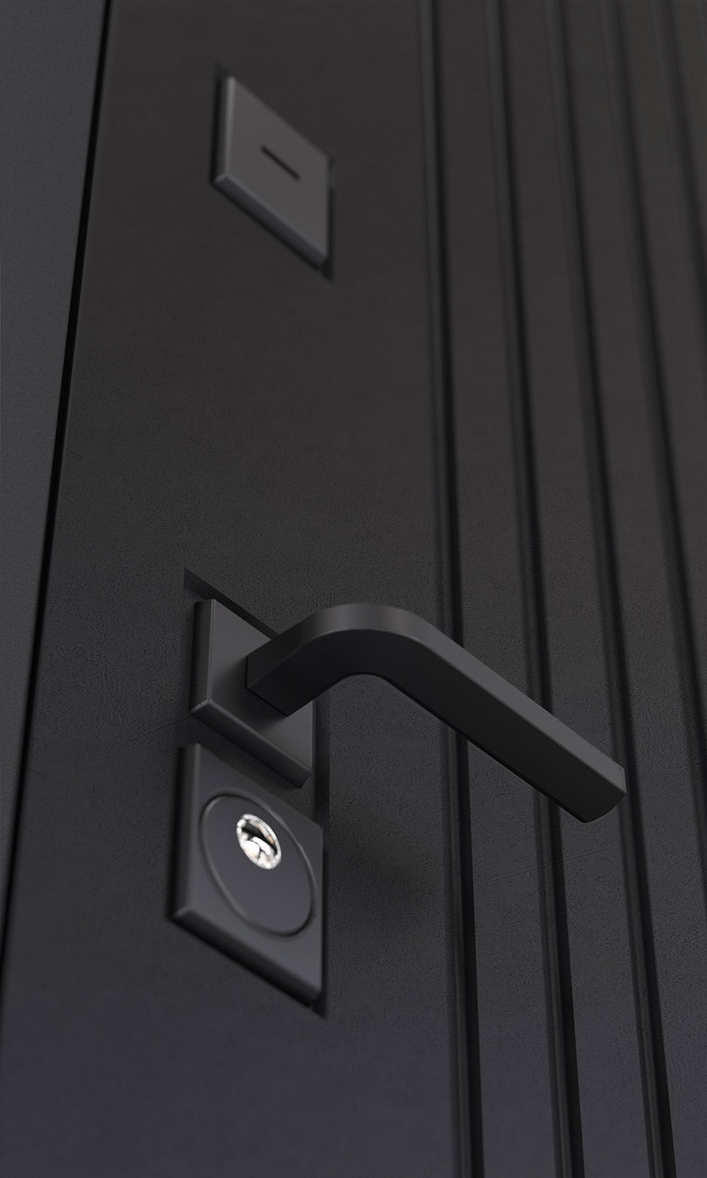Черная матовая: Броненакладкая, сувальдные накладки со шторкой, ручка, ночник, цилиндр ключ-вертушка, глазок вырезан сбоку